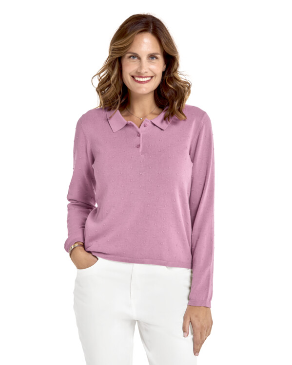 Myk, finstrikket genser med vakkert strukturmønster med små, vevde opphøyde prikker. Modellen har krage og kort knappestolpe foran.
