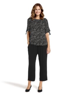 En lett og feminin bluse i mykt materiale som føles behagelig mot huden. Strikken i halsen gir en flatterende passform, mens korte ermer med splitt og knytebånd gir en elegant og dekorativ detalj. Dette er en perfekt bluse både til hverdags og fest, og den kan enkelt kombineres med bukser eller skjørt. Lengden følger størrelsen, ca. 66–70 cm. 100% viskose. Finvask 30°.