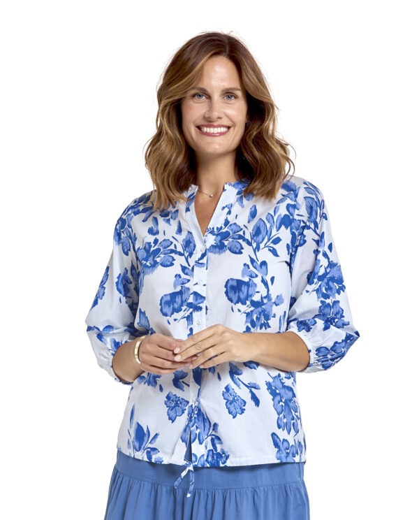 Lett og behagelig bluse i 100% bomull med v-hals og hel knappestolpe foran. Nederkant har snor slik at du enkelt kan justere passformen. 3/4-ermer med strikk og bærestykke bak med små folder som gir et fint fall.