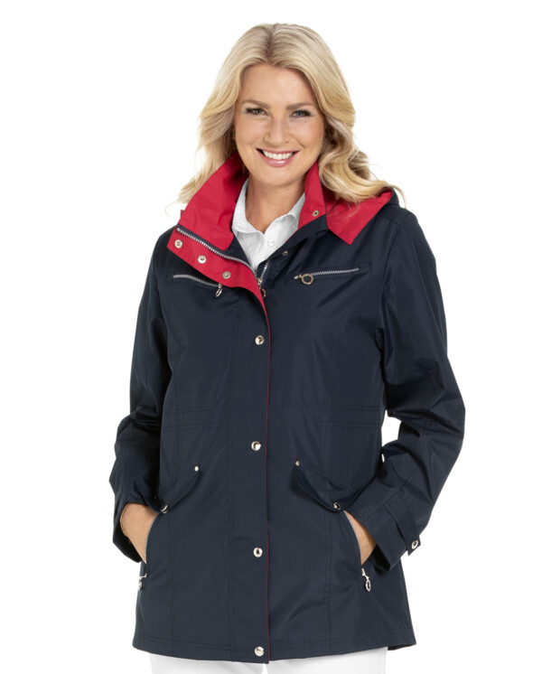 Hette som kan felles inn i kragen. Lukkes med glidelås. Lang glidelås som går opp i kragen. Trykkknapplukking med kontrasfarge på innsiden. Romslige lommer som lukkes med glidelås. Dekorative påsydde lommeklaffer. Trykknapp i ermslutt. Løpegang i midjen. En innerlomme. Lengden følger størrense ca 78-82 cm fra skulderen. Ytterstoff i 100% polyester. Finvask 40º. Farge marine/rød.