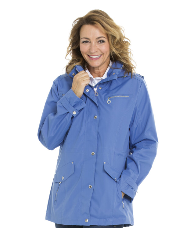 glidelås. Lang glidelås som går opp i kragen. Knappestolpe med trykknapp. Romslige lommer som lukkes med glidelås. Dekorative påstrikkede lommeklaffer. Trykknapp i ermeslutt. Løpegang i midje. En innerlomme. Ytterstoff i 100% polyester. Meshfôr. Lengden følger størrelsen ca 78-82 cm fra skulderen. Finvask 40°. Farge dueblå.
