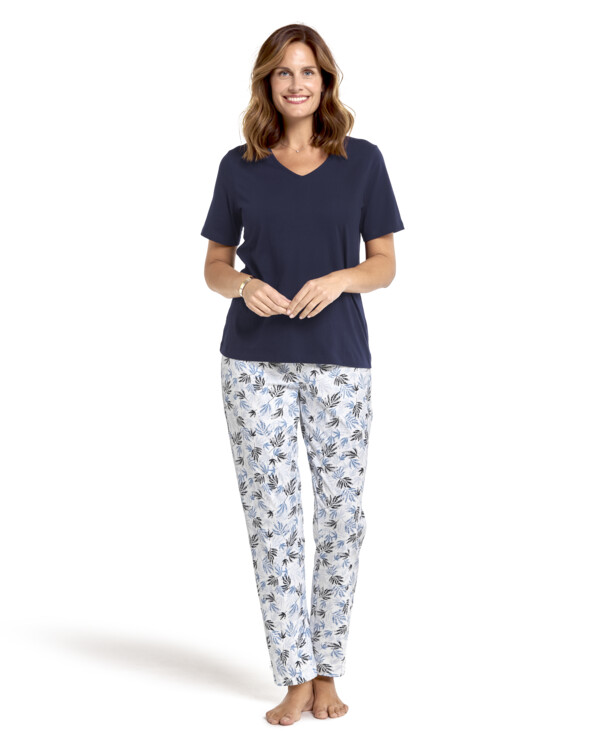 Behagelig pysjamas i 100% bomull. Overdelen har rund hals og en lengde på ca. 66 cm fra skulderen i alle størrelser. Buksen har mønster og strikk i livet for en god passform.