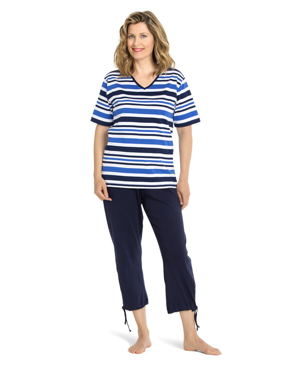 V-halset stripete overdel. Lengden følger størrelsen ca 67-73 cm fra skulderen. Capribukse med strikkmidje. Løpegang i benslutt. Lengden følger størrelsen ca 57-60 cm. 100% bomull.