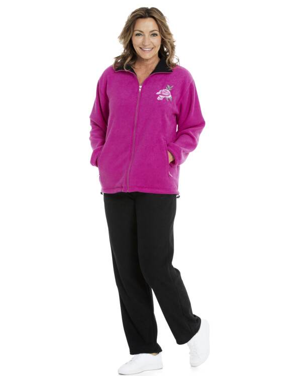 Jakke og bukse i myk terryfleece. Jakke medglidelås som går opp i kragen. Løpegang i nederkant. Fint broderi. Romslige l...