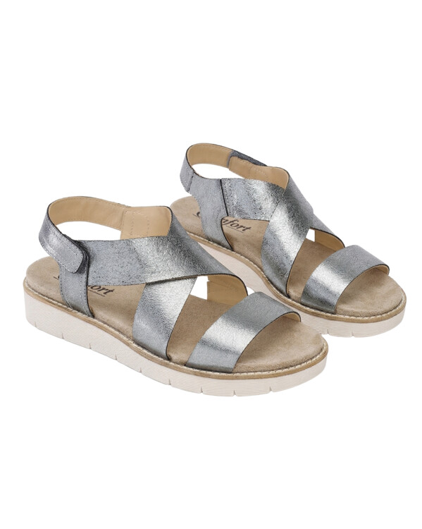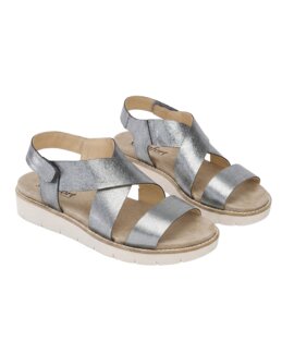 En fin vår og sommersandal med behagelig komfortsåle. Lett riflet yttersøle. Overdel i lær. Lukkes med borrelås. Elastikk på rem for bedre passform. Farger sølvgrå.