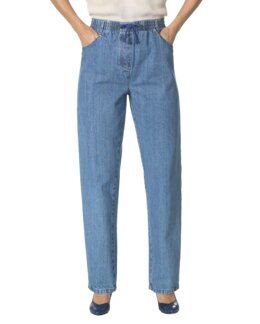 Behagelig modell med strikkmidje, snor og hemper. Lommer foran. Bærestykke bak. Innerbenlengde ca 78 cm i alle størrelse...